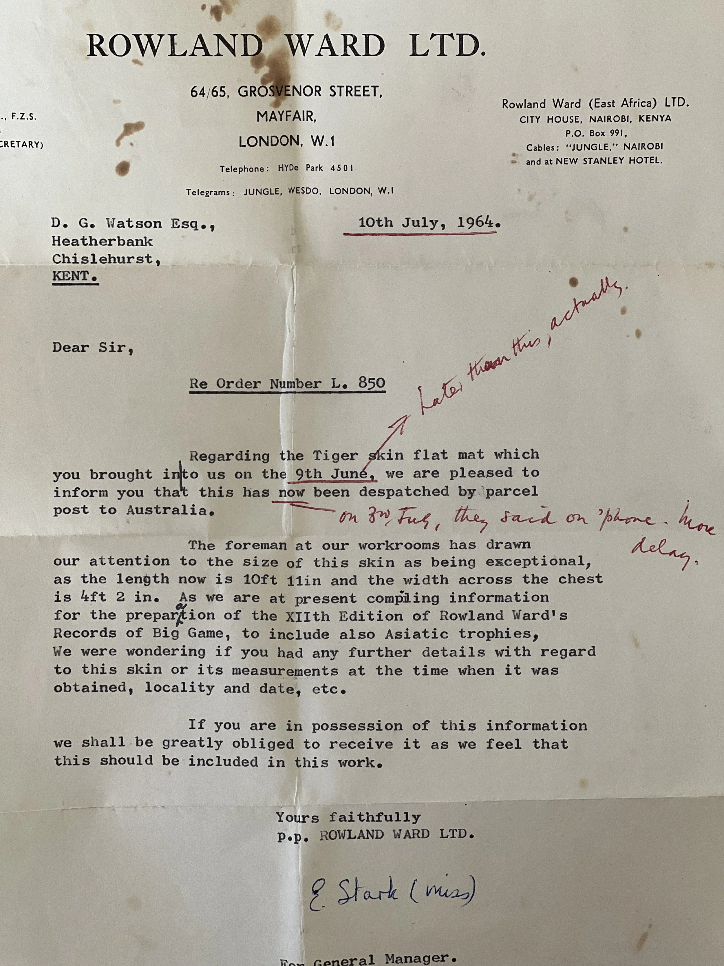 When we were cleaning out Cliff Road and deciding what to keep and what to discard; amongst the mountain of documents, furniture, paintings, photos, crockery etc of their full and busy lives, by sheer luck, I hung onto a bundle of personal correspondence from those years. Amongst the haul was a letter from Rowland Ward who writes about sending the tiger skin on to Australia. This company were the largest and most prominent taxidermists in the world. They were synonymous with the white hunters of yesteryear and according the letter, Mum’s tiger was a beast of enormous proportions that could have ended up in their Records of Big Game. But the letter too feeds further questions. It doesn’t provide proof or provenance about the animal and its undoubtedly terrible end but equally it gives weight to stories half told but never proven. For instance: who the heck is D G Watson Esq..?